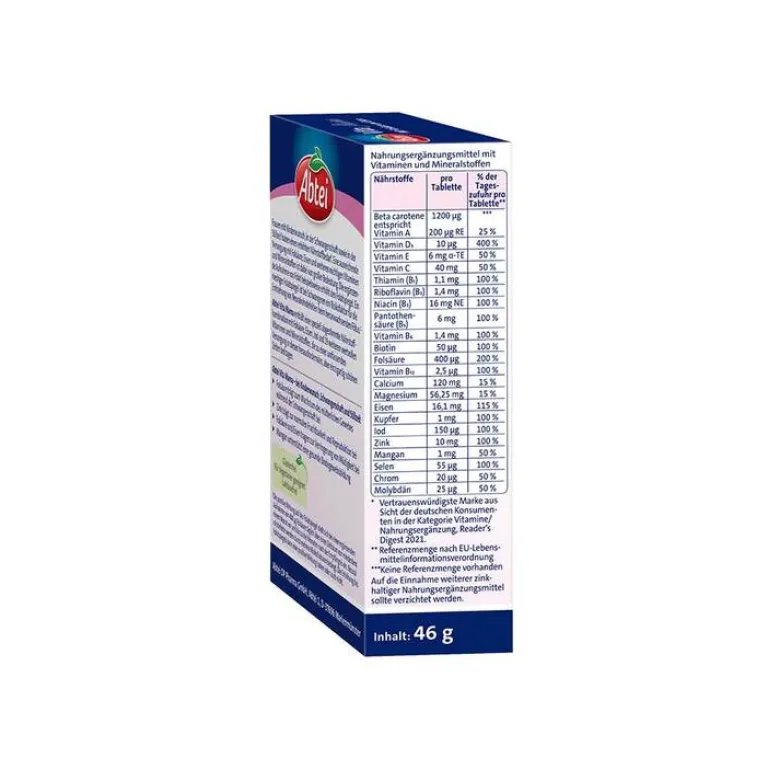Calciumcarbonat; Magnesiumoxid; Festigungsmittel mikrokristalline Cellulose, Polyvinylpyrrolidon; Eisenfumarat; L-Ascorbinsäure; Zinksulfat; Überzugsmittel Hydroxypropylmethylcellulose, Hydroxypropylcellulose, mikrokristalline Cellulose; Nicotinamid; Trennmittel Magnesiumsalze der Speisefettsäuren, Siliciumdioxid; Maisstärke; Feuchthaltemittel Vernetzte Carboxymethylcellulose; DL-α-Tocopherylacetat; Calcium-D-pantothenat; Mangansulfat; Farbstoffe Titandioxid, Eisenoxide und Eisenhydroxide; Kupfercarbonat; Pyridoxinhydrochlorid; Riboflavin; Thiaminmononitrat; β-Carotin; Pteroylmonoglutaminsäure; Kaliumiodid; Natriumselenit; Chrom(III)-chlorid; Natriummolybdat; D-Biotin; Cholecalciferol; Cyanocobalamin.