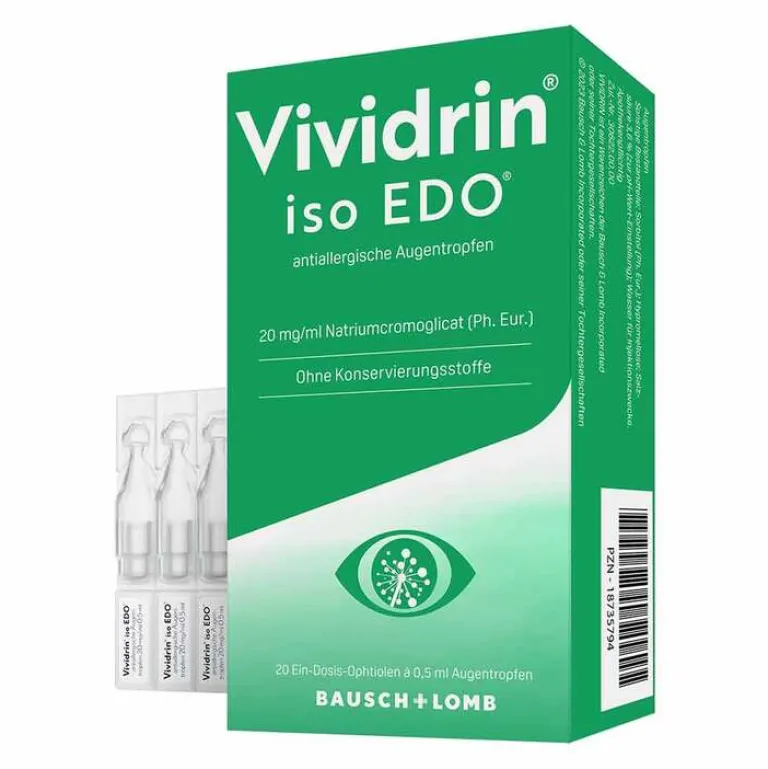 Vividrin® iso EDO antiallergische Augentropfen. Wirkstoff: Natriumcromoglicat (Ph.Eur.) Anwendungsgebiete: Arzneimittel zur Linderung der Symptome einer allergisch bedingten Bindehautentzündung (Antiallergikum). Es wird angewendet bei allergisch bedingter, akuter und chronischer Bindehautentzündung (Conjunctivitis), z.B. Heuschnupfen-Bindehautentzündung, Frühlingskatarrh ([Kerato-] Conjunctivitis vernalis). Warnhinweise: Arzneimittel für Kinder unzugänglich aufbewahren. Apothekenpflichtig. Zu Risiken und Nebenwirkungen lesen Sie die Packungsbeilage und fragen Sie Ihre Ärztin, Ihren Arzt oder in Ihrer Apotheke. Dr. Gerhard Mann, chem.-pharm. Fabrik GmbH, Brunsbütteler Damm 165/173, 13581 Berlin (Stand: April 2020)