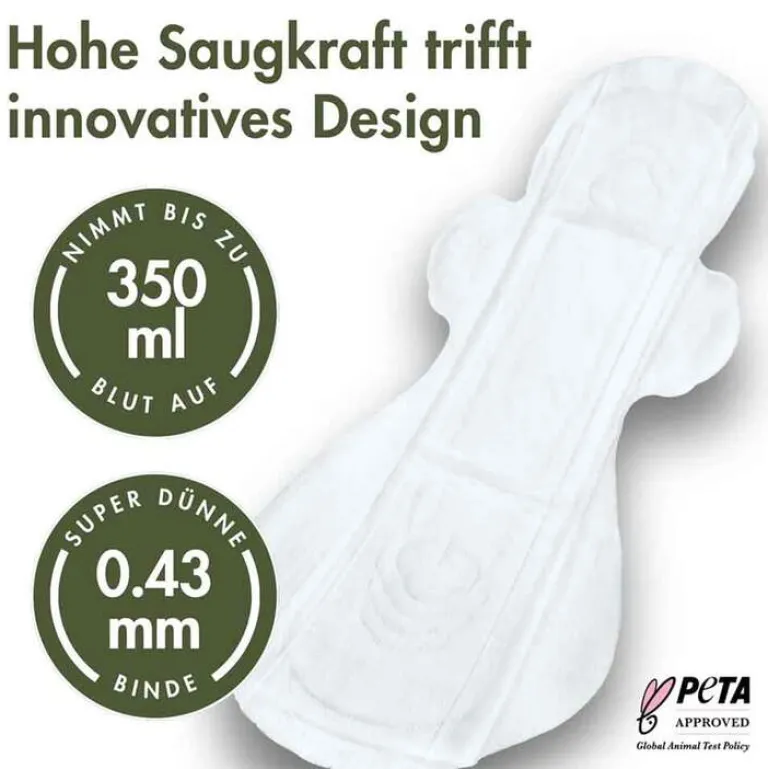 Das Topsheet ist aus Bio-Baumwolle, weitere Schichten bestehen aus Bambus und Zellstoff. Auf der Unterseite befindet sich ein Klebestreifen aus atmungsaktiver PE-Folie.