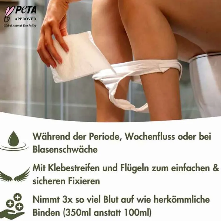 - Inhalt: 16 einzeln verpackte Wochenbettbinden mit einem Aufnahmevolumen von jeweils 350 ml.