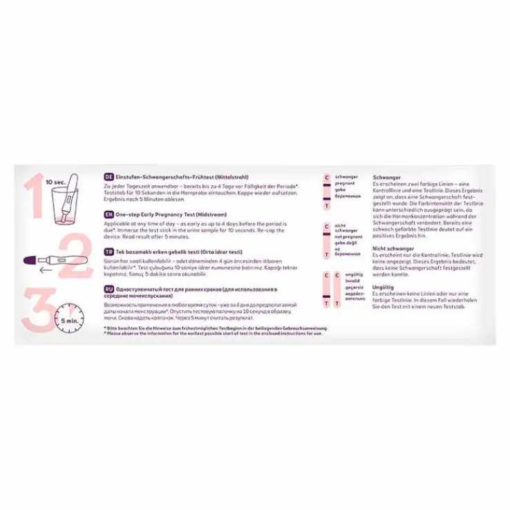 Der Schwangerschafts-Frühtest zeigt eine Schwangerschaft an, sobald eine Konzentration des Schwangerschaftshormons hcG von 10 mIU/ml erreicht ist. Der Urintest ist zu jeder Tageszeit anwendbar. Einfach den Teststab für 10 Sekunden direkt in den Urinstrahl halten und schon nach 5 Minuten das Ergebnis ablesen. Die Anwendung ist bereits bis zu 4 Tage vor Fälligkeit der Periode möglich. Der Test ist mit einer hygienischen Kappe versehen.
