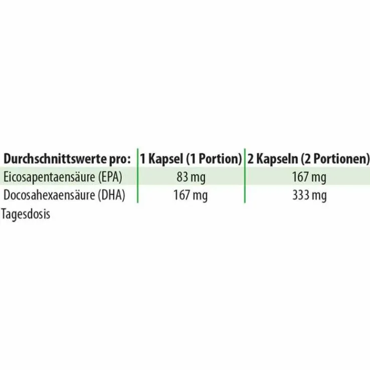 Algen liefern wichtige Omega-3-Fettsäuren und sind hierfür die gesunde, pflanzliche Alternative zu Fisch. In Dr. Jacob‘s DHA-EPA-Algenöl sind pro Kapsel (1 Portion) 250 mg DHA und EPA im Verhältnis von 2:1 enthalten.