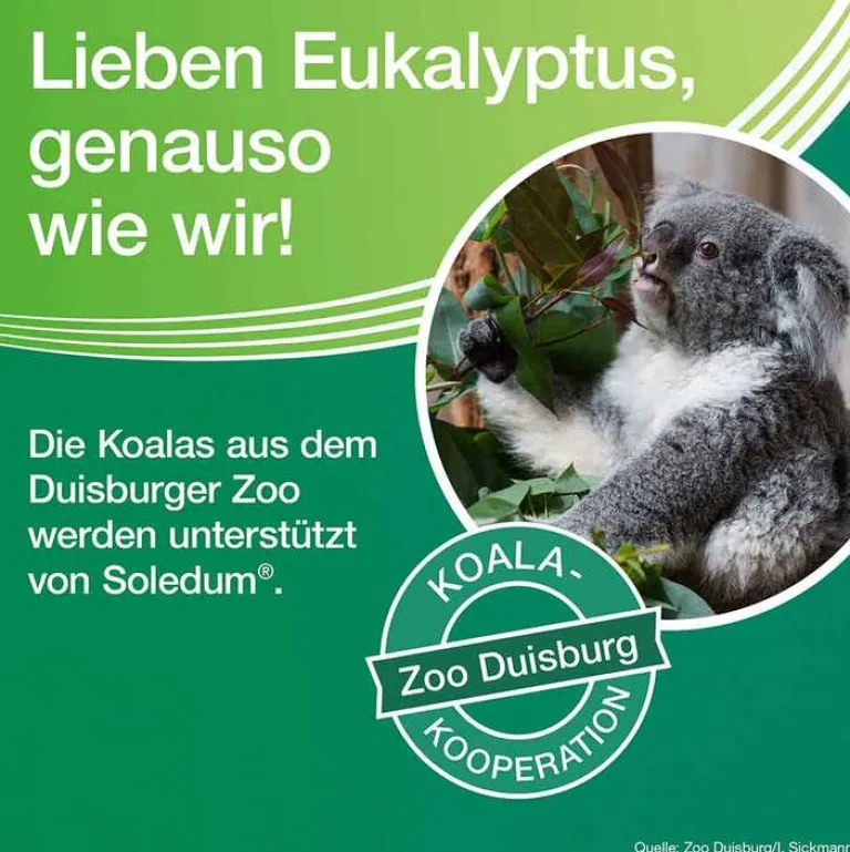 Soledum® Balsam Wirkstoff: Cineol. Anwendungsgebiete: Zur Verbesserung des Befindens bei Erkältungskrankheiten der oberen und unteren Atemwege (wie unkomplizierter Schnupfen, Heiserkeit, unkomplizierter Bronchialkatarrh, unkomplizierter Nasennebenhöhlenkatarrh). Soledum® Balsam ist ausschließlich für die äußere Anwendung (Inhalation, Einreibung) vorgesehen. Nicht zum Einnehmen. Wenn Sie sich nach 7 Tagen nicht besser oder gar schlechter fühlen, wenden Sie sich an Ihren Arzt. Zu Risiken und Nebenwirkungen lesen Sie die Packungsbeilage und fragen Sie Ihre Ärztin, Ihren Arzt oder in Ihrer Apotheke.