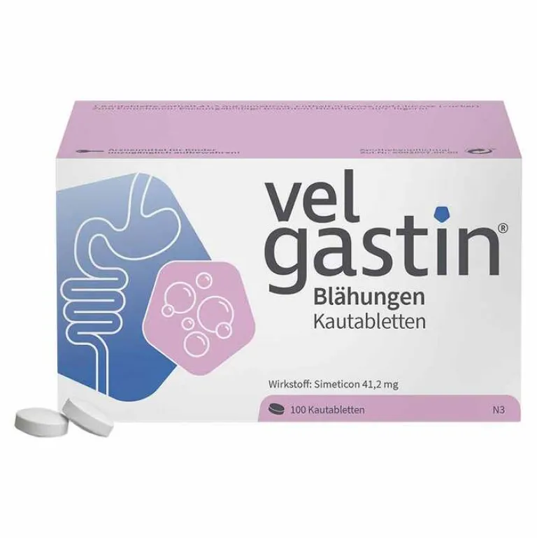 Velgastin® Blähungen Kautabletten.Wirkstoff: Simeticon 41,2 mg/ml Anwendungsgebiete: Zur symptomatischen Behandlung gasbedingter Magen-Darm-Beschwerden, z. B. Blähungen (Meteorismus), Völlegefühl. Zur Vorbereitung von Untersuchungen im Bauchbereich, wie z.B. Röntgen und Sonographie. Zu Risiken und Nebenwirkungen lesen Sie die Packungsbeilage und fragen Sie Ihren Arzt oder Apotheker. Zu Risiken und Nebenwirkungen lesen Sie die Packungsbeilage und fragen Sie Ihre Ärztin, Ihren Arzt oder in Ihrer Apotheke. Stand: 05/2023 Engelhard Arzneimittel GmbH & Co.KG Herzbergstr. 3, 61138 Niederdorfelden Telefon: 06101/539-300