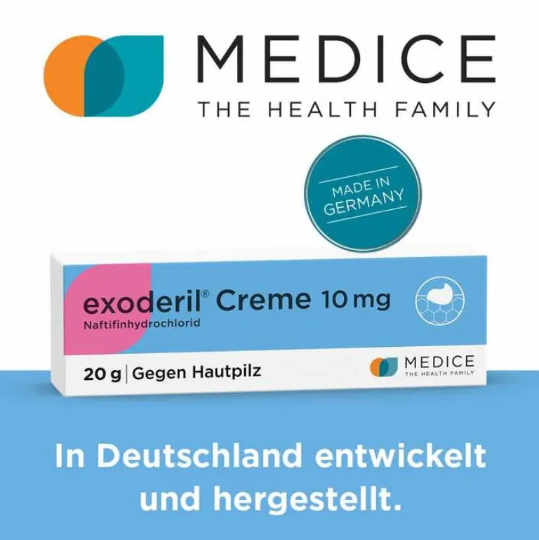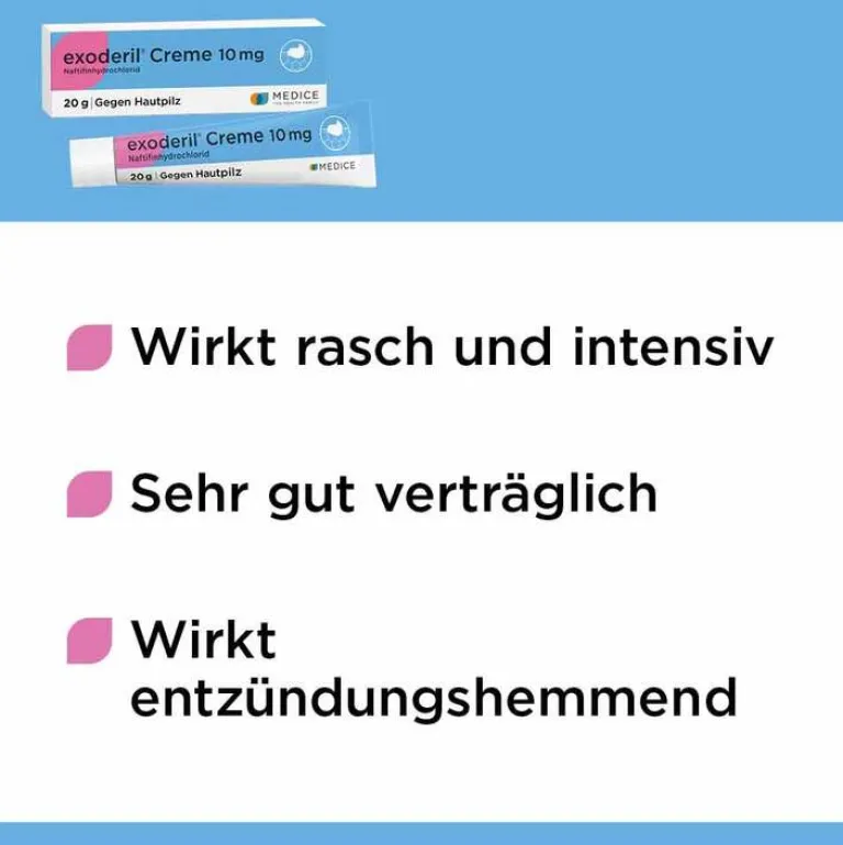 exoderil® Creme 10 mg; Anwendungsgebiete: Pilzinfektionen der Haut (Dermatomykosen), verursacht durch Dermatophyten, Hefe und Schimmelpilze sowie Mischinfektionen mit Bakterien. Warnhinweise: Enthält Stearylalkohol und Cetylalkohol. Nicht in die Augen bringen. Zu Risiken und Nebenwirkungen lesen Sie die Packungsbeilage und fragen Sie Ihre Ärztin, Ihren Arzt oder in Ihrer Apotheke; 02/2018
