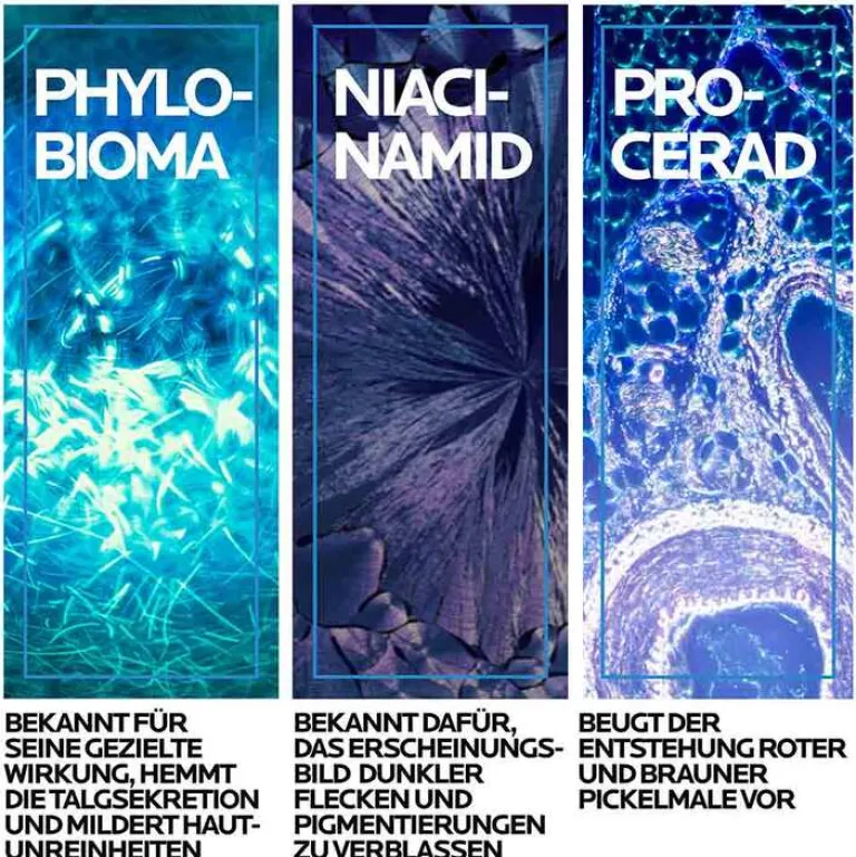 Der neue Wirkstoff Phylobioma mildert die Überproduktion von Talg und glättet das Hautbild sowie korrigiert wissenschaftlich bestätigt Hautunreinheiten. Zusätzlich hilft Niacinamid dabei, das Erscheinungsbild dunkler Flecken und Pigmentierungen zu verblassen.