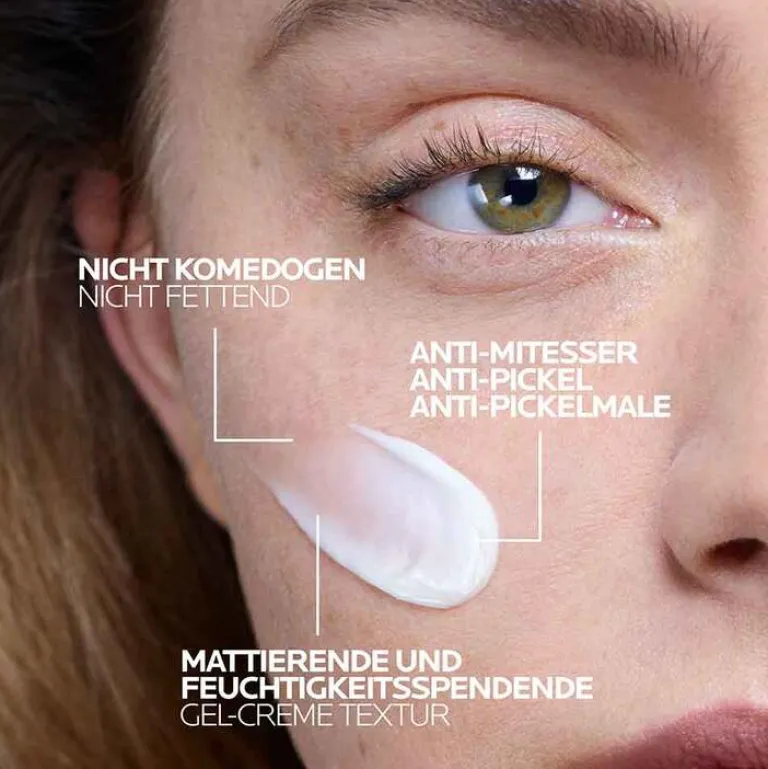 Für die vorherige Gesichtsreinigung eignet sich z. B. Effaclar schäumendes Reinigungsgel optimal. Eine haselnussgroße Menge der Gesichtscreme mit sanften, leicht streichenden Bewegungen auf Stirn und Gesicht einmassieren und die Augenpartie dabei aussparen.