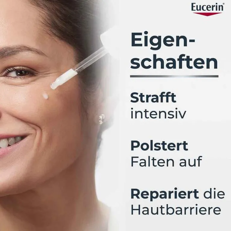 Die Formel der Anti Aging Gesichtspflege kombiniert hochkonzentrierte Hyaluronsäure mit Glycerin und versorgt die Haut intensiv mit Feuchtigkeit. Auf diese Weise sorgt das Gesichtsserum von Eucerin® für spürbar straffere Haut und wirkt dem Alterungsprozess der Haut entgegen. Zusätzlich fördert das enthaltene Provitamin B5 den Regenerationsprozess der Haut und stärkt so die Hautbarriere sowie die Widerstandskraft gegen äußere Einflüsse.