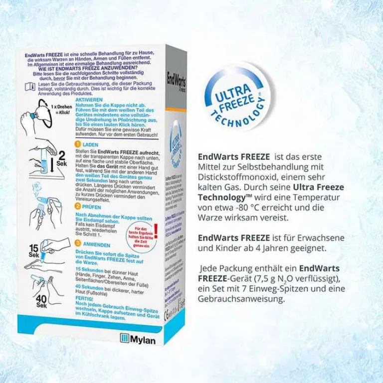 EndWarts® FREEZE ist eine schnelle Behandlung für zu Hause, die wirksam Warzen (gewöhnliche Warzen und Dornwarzen) an Händen, Armen und Füßen entfernt. In den meisten Fällen ist eine einmalige Behandlung ausreichend. Es ist ein Mittel zur Selbstbehandlung mit dem Gas Distickstoffmonoxid (N2O), das nach der Aktivierung des Gerätes eine Temperatur von etwa -80 °C erreicht und die Warze wirksam vereist.