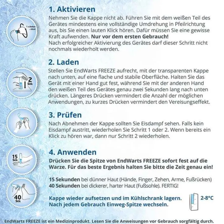 Nur vor der ersten Anwendung muss EndWarts® FREEZE einmalig aktiviert werden. Prüfen Sie das Gerät vor jeder Anwendung wie beschrieben in der Gebrauchsanweisung.