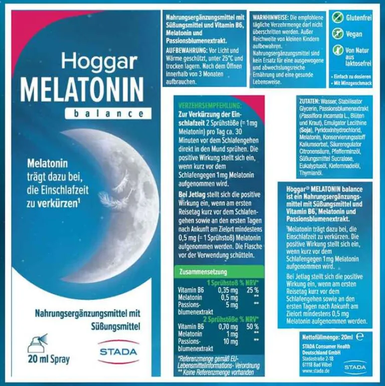 Das einfach anzuwendende Direktspray enthält Melatonin*, einen wertvollen natürlichen Pflanzenextrakt der Passionsblume und das Nervenvitamin B6**. Hoggar Melatonin Balance Spray trägt dazu bei, die Einschlafzeit zu verkürzen*.