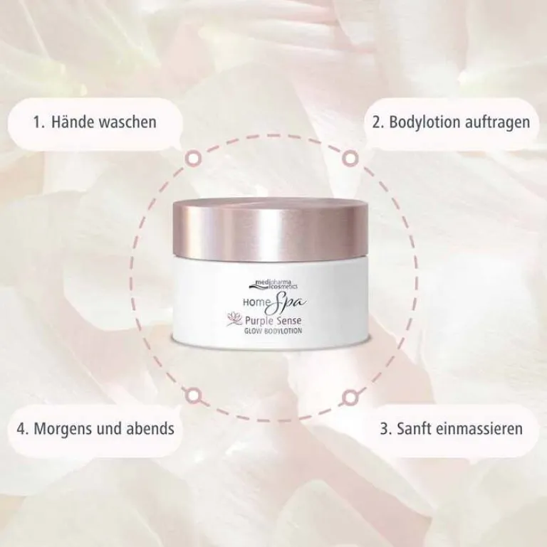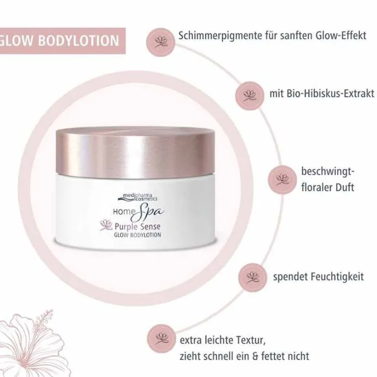 Die medipharma cosmetics Home Spa Purple Sense Glow Bodylotion pflegt die Haut mit Glycerin, feuchtigkeitsspendender Hyaluronsäure und Bio-Hibiskus-Extrakt für ein sinnliches Spa-Erlebnis im eigenen Zuhause.