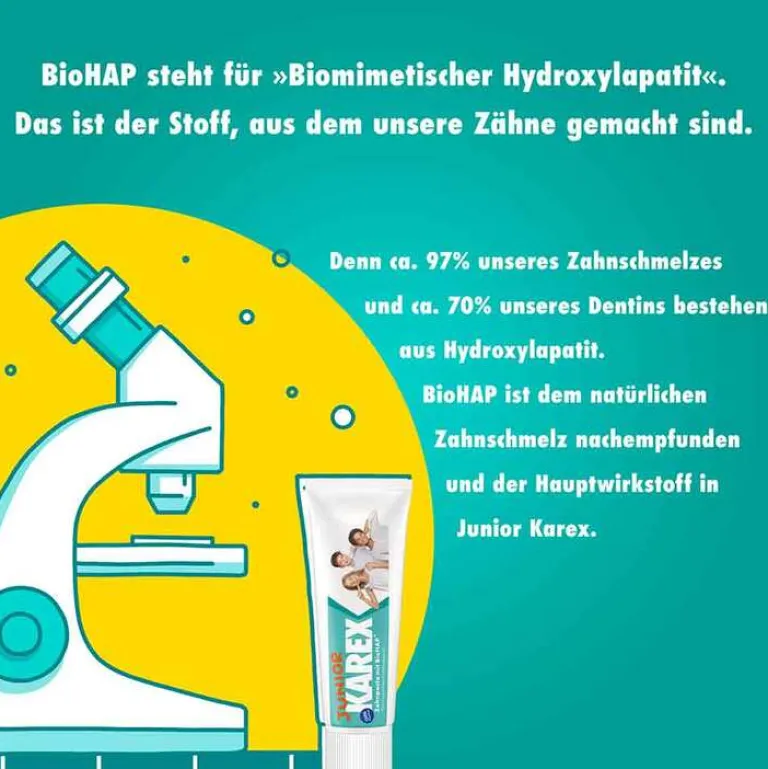 Das Wechselgebiss besteht aus Milchzähnen und bleibenden Zähnen mit unterschiedlichen Anforderungen an die Zahnpflege. Die Junior Karex Zahnpasta setzt auf den biomimetischen Wirkstoff BioHAP*. Das ist der Stoff, aus dem unsere Zähne gemacht sind. Ca. 97% unseres Zahnschmelzes und ca. 70% unseres Dentins bestehen aus Hydroxylapatit.