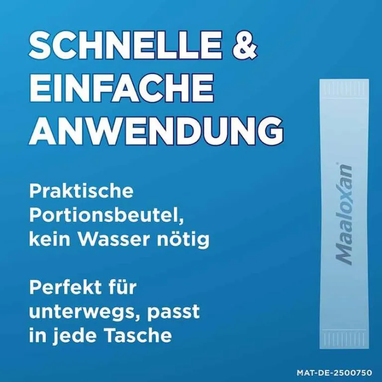 Maaloxan® 25 mVal Suspension. Wirkstoffe: Algeldrat, Magnesiumhydroxid. Anw.-geb.: Zur symptomat. Behandl. von Erkrankungen, bei denen die Magensäure gebunden werden soll: Sodbrennen und säurebedingte Magenbeschwerden, Magen- oder Zwölffingerdarmgeschwüre (Ulcus ventriculi und Ulcus duodeni). Hinweise: Nicht bei Kindern unter 12 Jahren anwenden. Beschwerden, die länger als 2 Wochen bestehen, klinisch abklären lassen. Enthält Sorbitol, Pfefferminzöl, Methyl-4-hydroxybenzoat und Propyl-4-hydroxybenzoat (Parabene). Die Einnahme anderer Arzneimittel sollte grundsätzlich mindestens 2 h vor oder nach Einnahme von Maaloxan Suspension erfolgen. Apothekenpflichtig. Zu Risiken und Nebenwirkungen lesen Sie die Packungsbeilage und fragen Sie Ihre Ärztin, Ihren Arzt oder in Ihrer Apotheke. A. Nattermann & Cie. GmbH, Brüningstraße 50, 65929 Frankfurt am Main. Stand: Juli 2022. MAT-DE-2001977