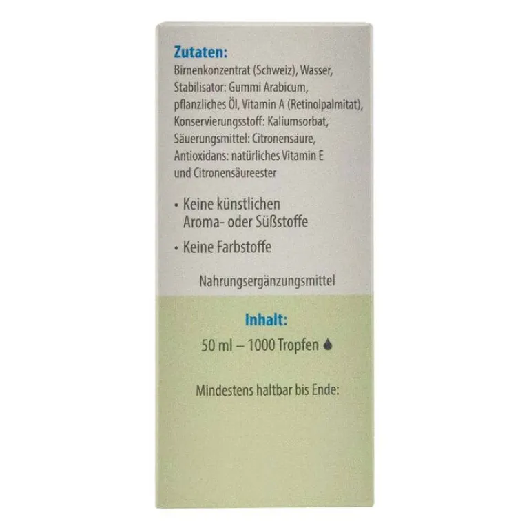 Birnenkonzentrat (Schweiz), Wasser, Stabilisator: Gummi Arabicum, pflanzliches Öl, Vitamin A (Retinolpalmitat), Konservierungsstoff: Kaliumsorbat, Säuerungsmittel: Citronensäure, Antioxidans: natürliches Vitamin E und Citronensäureester.