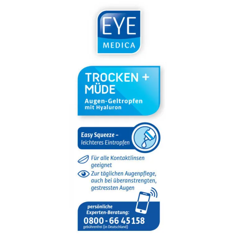 EyeMedica® Trocken + Müde Augen-Geltropfen eignen sich zur täglichen Augenpflege. Sie stabilisieren den Tränenfilm und befeuchten die Augenoberfläche intensiv und lang anhaltend. Durch die hohe Wasserbindungskapazität werden überanstrengte, gestresste Augen erfrischt. Sie bilden zudem einen gleichmäßigen, langhaftenden Schutzfilm, ohne die Sehleistung zu beeinträchtigen.