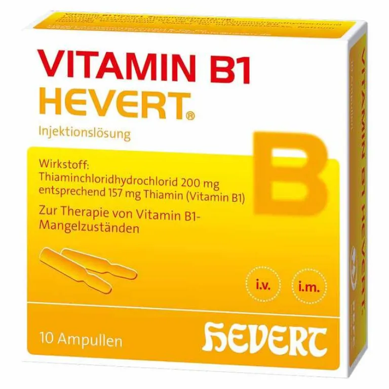 Vitamin B1 Hevert.Anwendungsgebiete: Zur Anfangsbehandlung schwerer Formen der Wernicke-Enzephalopathie (eine durch Vitamin B1-Mangel bedingte Erkrankung des Gehirns) und der Beri-Beri (Vitamin B1-Mangelkrankheit). Zu Risiken und Nebenwirkungen lesen Sie die Packungsbeilage und fragen Sie Ihre Ärztin, Ihren Arzt oder in Ihrer Apotheke.