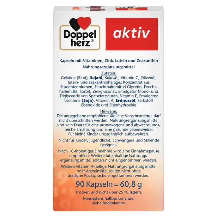 Gelatine (Rind), SOJAÖL, Kokosöl, L-Ascorbinsäure, Olivenöl, lutein- und zeaxanthinhaltiges Konzentrat aus Studentenblumen, Feuchthaltemittel Glycerin, Feuchthaltemittel Sorbit, Zinkgluconat, Emulgator Mono- und Diglyceride von Speisefettsäuren, DL-Alpha-Tocopherol, Emulgator Lecithine (SOJA), Retinylpalmitat, ERDNUSSÖL, Farbstoff Eisenoxide und Eisenhydroxide.