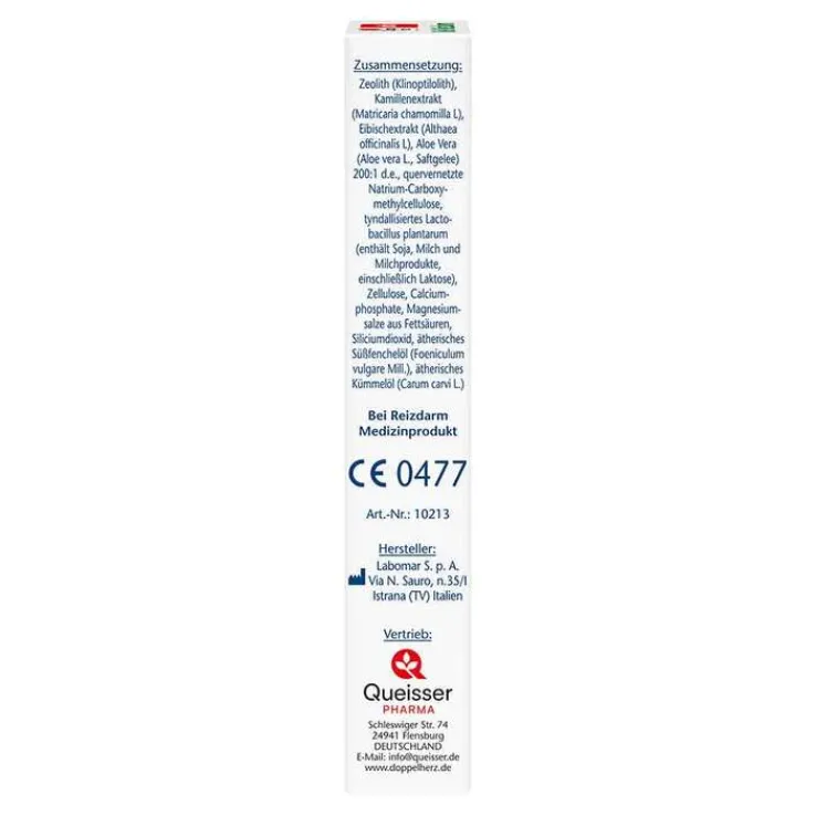 Zeolith (Klinoptilolith), Kamillenextrakt (Matricaria chamomilla L), Eibischextrakt (Althaea officinalis L) Aloe Vera (Aloe vera L., Saftgelee) 200:1 d.e., quervernetzte Natrium-Carboxymethylcellulose, tyndallisiertes Lactobacillus plantarum (enthält Soja, Milch und Milchprodukte, einschließlich Laktose), Zellulose, Calciumphosphate, Magnesiumsalze aus Fettsäuren, Siliciumdioxid, ätherisches Süßfenchelöl (Foeniculum vulgare Mill.), ätherisches Kümmelöl (Carum carvi L.)