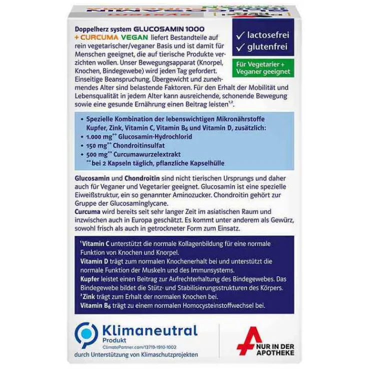 Doppelherz system Glucosamin 1.000 + Curcuma vegan enthält eine spezielle Kombination der lebenswichtigen Mikronährstoffe Kupfer, Zink, Vitamin C, Vitamin B6 und Vitamin D. Zusätzlich sind 1.000 mg Glucosamin-Hydrochlorid, 200 mg MSM (Methylsulfonylmethan) und 500 mg Curcumawurzelextrakt bei Einnahme von 2 Kapseln enthalten.