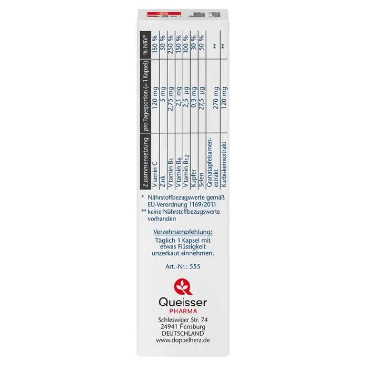 120 mg Vitamin C, 5 mg Zink, 2,75 mg Vitamin B1, 2,1 mg Vitamin B6, 2,5 µg Vitamin B12, 300 µg Kupfer, 27,5 µg Selen, 270 mg Granatapfelextrakt, 120 mg Kürbiskernextrakt.