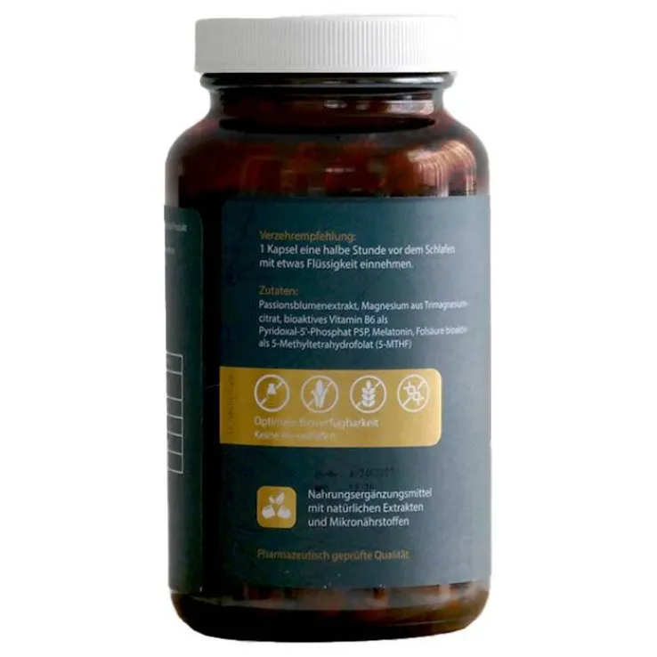Passionsblumenextrakt, Tri-Magnesiumcitrat, bioaktives Vitamin B6 als Pyridoxal-5‘-Phosphat P5P, Melatonin, bioaktive Folsäure als 5’Methyltetrahydrofolat (5-MTHF).