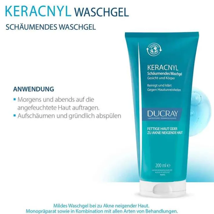 Morgens und abends auf die feuchte Haut auftragen, aufschäumen, gründlich mit Wasser abspülen und dann abtrocknen. Bei Augenkontakt die Augen gründlich mit Wasser ausspülen. Tägliche, milde Reinigung für zu Akne neigende Haut, für Gesicht und Körper. Das Ducray Keracnyl Waschgel reinigt die Haut sanft und porentief. Kann allein oder in Kombination mit Akne-Behandlungen verwendet werden.