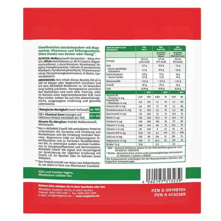 MEGAMAX Eiweiß 100 besteht aus Milcheiweiß und Molkenprotein. Diese Proteine unterstützen Ihren Körper bei der Zunahme und Erhaltung von Muskelmasse und tragen auch zu einer Erhaltung normaler Knochen bei. Daneben enthält MEGAMAX Eiweiß 100 auch eine Auswahl von Vitaminen. Vitamin B12 zum Beispiel trägt zu einem normalen Ablauf Ihres Energiestoffwechsels bei und Vitamin C unterstützt die normale Funktion Ihres Immunsystems während und nach intensiver körperlicher Betätigung.