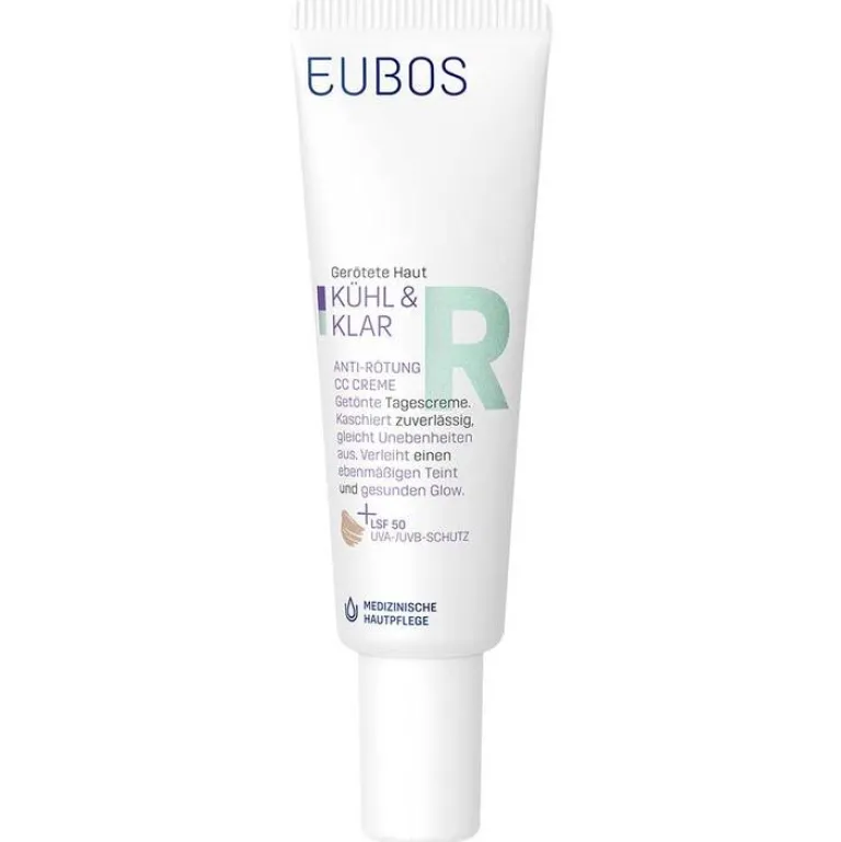 Die Eubos Kühl & Klar Anti-Rötung CC Creme ist ein medizinisches Pflegeprodukt mit hohem Lichtschutzfaktor 50. Abdeckende, hauttonkorrigierende Farbpigmente mit Blur-Effekt kaschieren Rötungen zuverlässig. Die CC-Creme ist mit einem Phyto-Aktivstoffkomplex, der Entzündungen hemmt und Rötungen reduziert. Sie ist Therapie begleitend bei Couperose und Rosacea anwendbar.