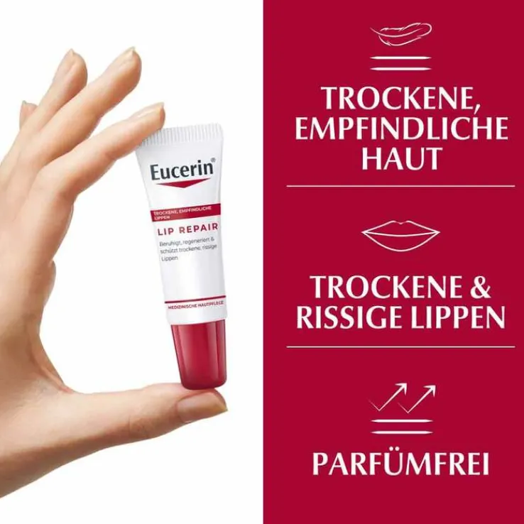 Eucerin® Lip Repair ist ein hochwirksamer Balsam mit Wirkstoffen, die spröde, rissige und gereizte Haut beruhigen und regenerieren. Durch die enthaltenen Lipide wird die Haut besser mit Feuchtigkeit versorgt und Symptome lang anhaltend gelindert. Es bietet gleichzeitig Schutz vor Umweltbelastungen wie freie Radikale. Um das Hautbild der Lippen sichtbar zu verbessern, nach Bedarf auftragen.