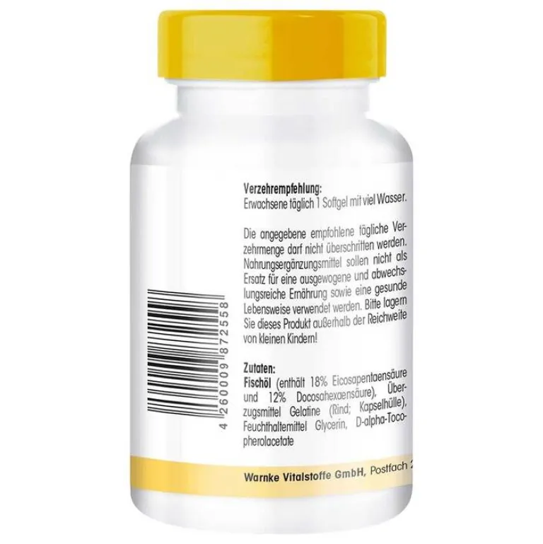Fischöl (enthält 18% Eicosapentaensäure und 12% Docosahexaensäure), Gelatine (Rind; Kapselhülle), Feuchthaltemittel Glycerin, D-alpha-Tocopherylacetat