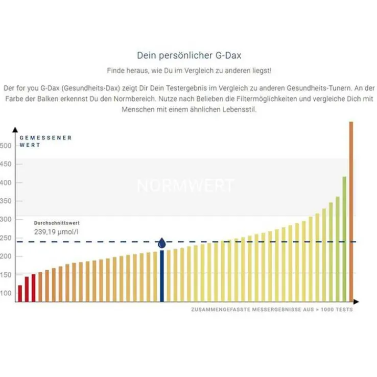 Ein Aminosäurenmangel kann sich auf Körper und Psyche auswirken. Das for you aminogramm ist ein Bluttest für Zuhause und misst die Eiweißbausteine – 8 essentielle, 4 semi-essentielle und 8 weitere nicht-essentielle Aminosäuren. Diesen Bluttest können Sie schnell, einfach und bequem von zuhause aus durchführen. Innerhalb weniger Tage stellen wir online Ihren individuellen Ergebnisbericht für Sie bereit – leicht verständlich und ausführlich von unseren Experten aufbereitet. Die Dienstleistung wird innerhalb von ca. 10 bis 15 Werktage nach Eingang Ihrer Probe im Labor erbracht.