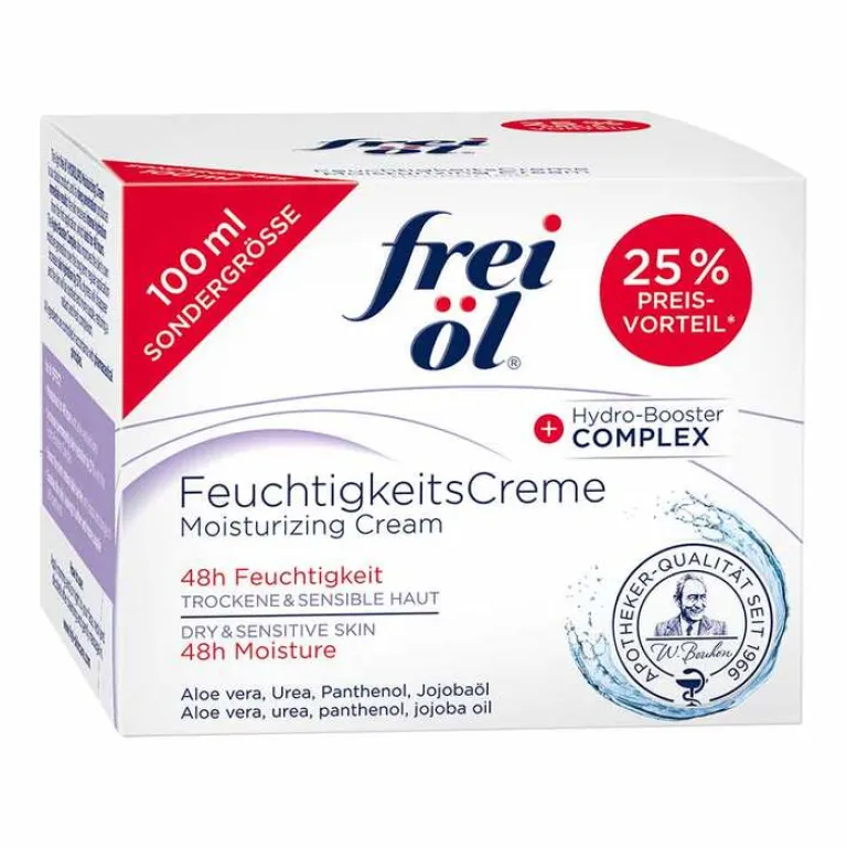 Die leichte Frei Öl Hydrolipid Feuchtigkeitscreme – ist der Frei Öl Klassiker mit Soforteffekt und Tiefenwirkung: Bereits nach der ersten Anwendung wird die Haut mit intensiver Feuchtigkeit versorgt, die 48 Stunden anhält. Gleichzeitig wird dank des Hydro-Booster-Komplexes auch die hauteigene Feuchtigkeitsversorgung langfristig verbessert: So wird bei regelmäßiger Anwendung die Feuchtigkeit der Haut um 37% erhöht. Sie verliert ihre Trockenheit, wirkt entspannt, beruhigt und bekommt einen strahlend frischen Teint. Alle Inhaltsstoffe werden nach pharmazeutischen Prinzipien kontrolliert.