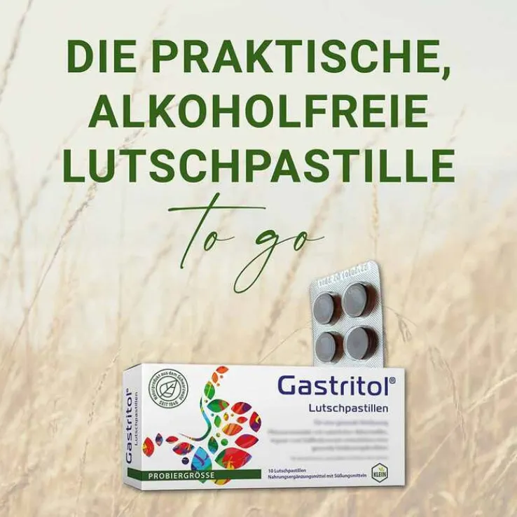 Gastritol Lutschpastillen enthalten natürliche Bitterstoffe. Sie sind ideal für unterwegs und eignen sich für die gesamte Familie, von Erwachsenen über Jugendliche bis hin zu Kindern ab 6 Jahren. Zudem sind sie frei von Alkohol, Laktose und Gluten. Die Lutschpastillen sind vegan, ohne Gentechnologie und Aluminium.