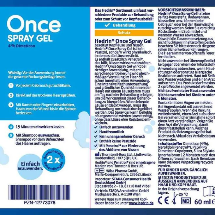 * Hedrin® Once kann schon innerhalb einer Anwendung wirken. Eine Nachuntersuchung muss jedoch eine Woche nach der Anwendung durchgeführt werden, um sicherzustellen, dass keine Läuse oder Nissen übersehen wurden. Wenn lebende Läuse entdeckt werden, kann die Behandlung nochmals durchgeführt werden. 1 Die Erstattungsfähigkeit bezieht sich auf Hedrin® Once Liquid Gel für Kinder ab sechs Monaten bis zum vollendeten 12. Lebensjahr sowie für Jugendliche bis zum vollendeten 18. Lebensjahr mit Entwicklungsstörungen zur physikalischen Behandlung des Kopfhaars bei Läusebefall.