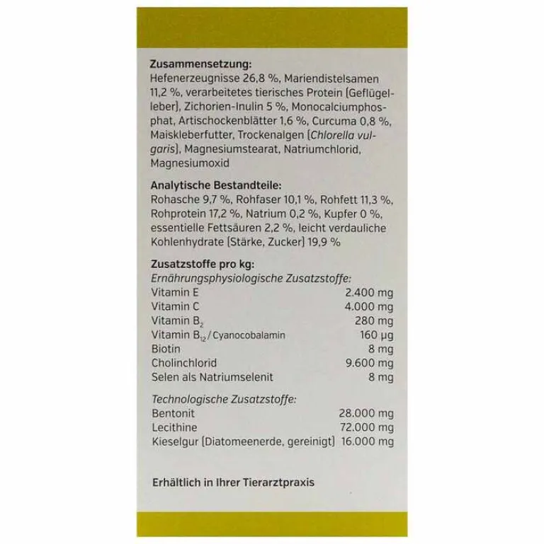 Hefeerzeugnis 26,8%, Mariendistelsamen 11,2%, verarbeitetes tierisches Protein (Geflügelleber), Zichorien-Inulin 5%, Monocalciumphosphat, Artischockenblätter 1,6%, Curcuma 0,8%, Maiskleberfutter, Trockenalgen (Chlorella vulgaris), Magnesiumstearat, Natriumchlorid, Magnesiumoxid