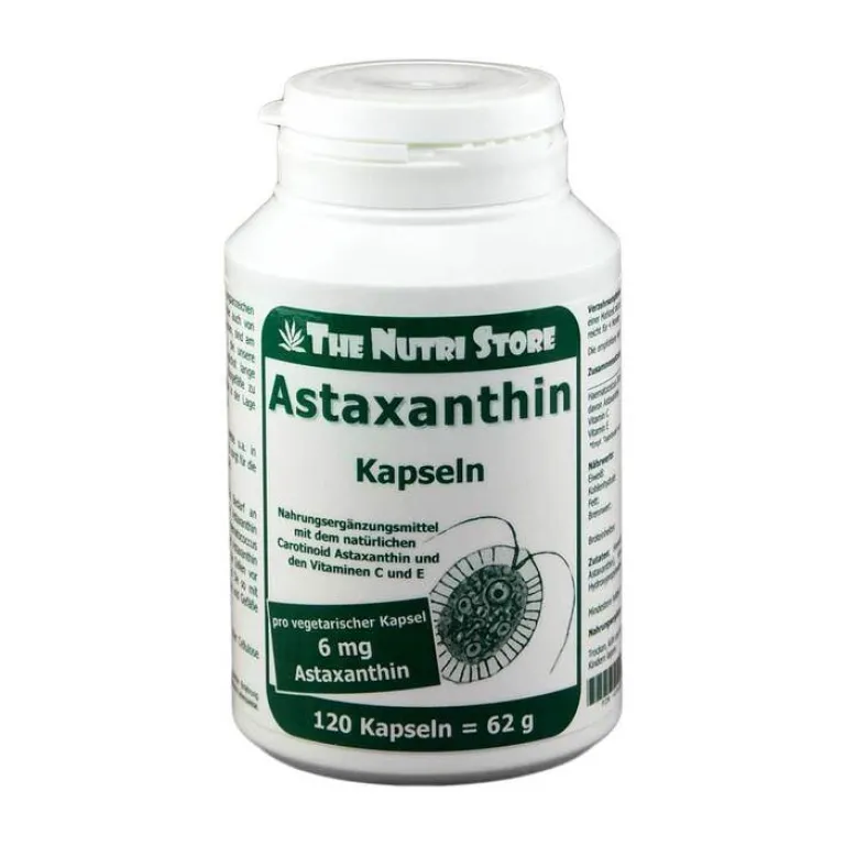 Zusammensetzung pro Kapsel: Haematococcus Extrakt 400 mg, davon Astaxanthin 6,0 mg, Vitamin C 16,0 mg, Vitamin E 2,4 mg