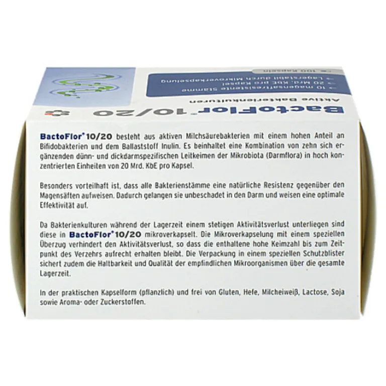 BactoFlor 10/20 bietet eine umfassende probiotische Versorgung, da es ein äußerst breites Spektrum an 10 dünn- und dickdarmspezifischen Leitkulturen in einer sehr hohen Konzentration von 20 Mrd. (20×109) koloniebildenden Einheiten (KBE) pro Kapsel besitzt. Dadurch wird die natürliche Vielfalt der Darmflora in besonderem Masse berücksichtigt.