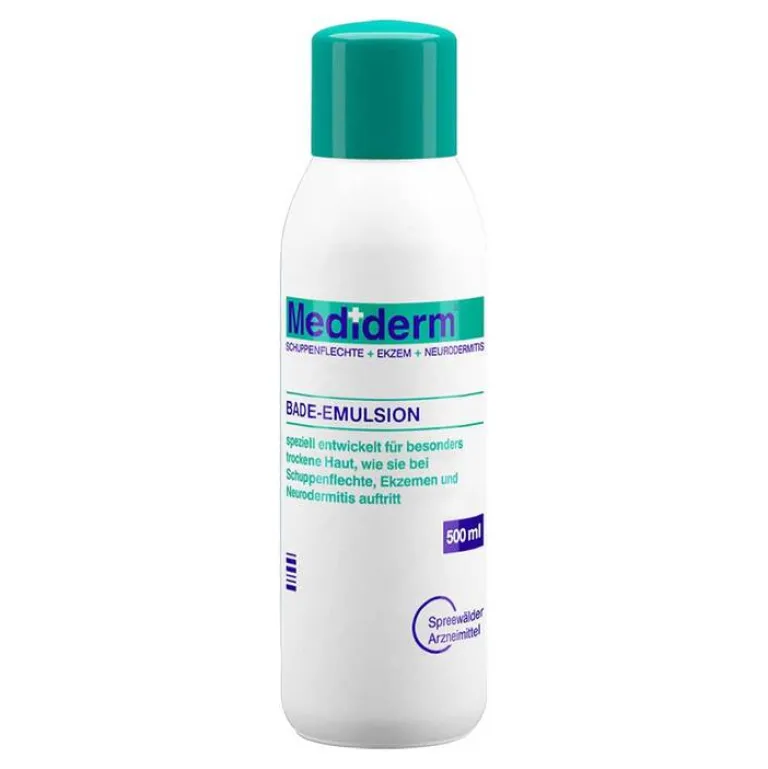Mediderm® Bade-Emulsion ist eine spezielle feuchtigkeitsspendende Öl-Emulsion zum Baden. Sie wurde speziell entwickelt für die professionelle Pflege der Haut bei Krankheiten wie Schuppenflechte, Ekzem und Neurodermitis. Mediderm® Bade-Emulsion ölt die Haut,reduziert übermäßige Schuppenbildung und das Hautgefühl wird spürbar straffer. Sorgt für langanhaltende Geschmeidigkeit, indem es Spannungen der Haut reduziert. Mediderm® Bade-Emulsion hilft die natürliche Lipidbarriere zu regenerieren, verhindert übermäßigen Feuchtigkeitsverlust, wodurch der Feuchtigkeitsgehalt auch in den tieferen Schichten der Haut aufrechterhalten wird. So unterstützt Mediderm® Bade-Emulsion die Linderung von Begleitsymptomen trockener Haut wie Rötungen, Juckreiz und Brennen.
