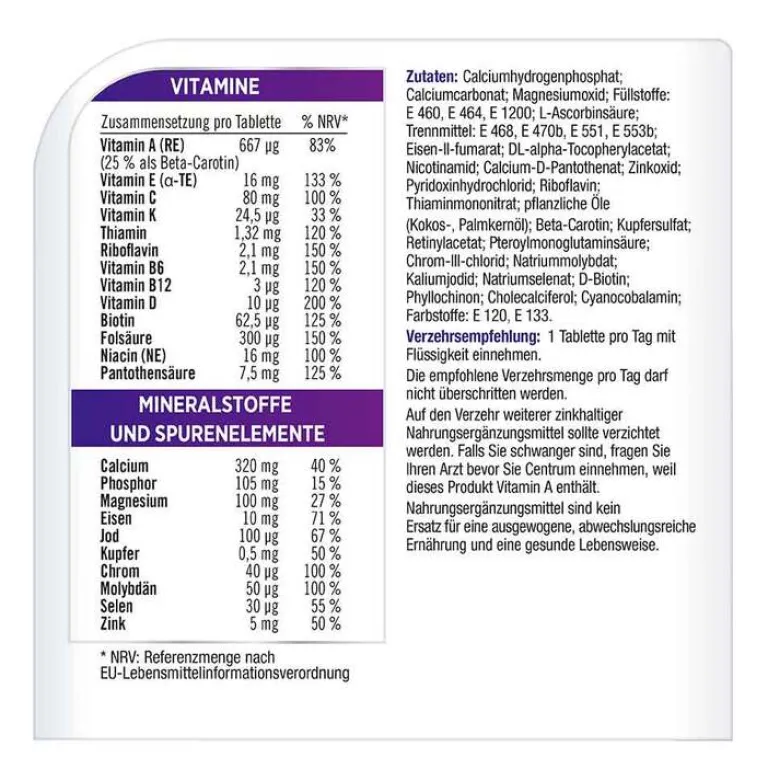 Die Centrum Formulierungen werden auf Grundlage wissenschaftlicher Forschungen entwickelt und von Nährstoffexperten formuliert. Sämtliche Mikronährstoffe sind auf Sicherheit geprüft und zertifiziert.