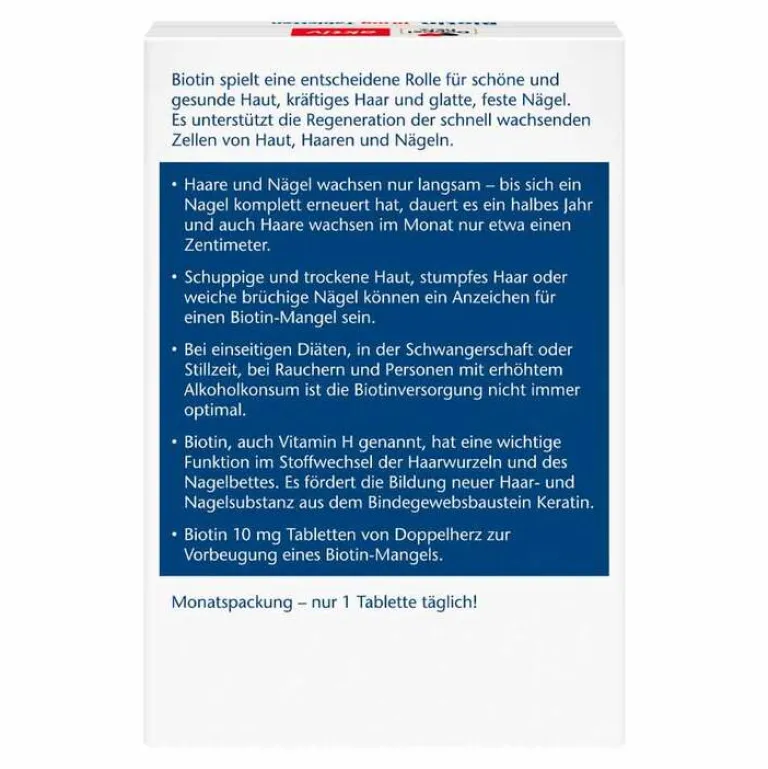 Doppelherz® Biotin 10 mg Tabletten zum Einnehmen ist ein Arzneimittel mit dem Wirkstoff Biotin. Biotin, auch Vitamin H genannt, hat eine wichtige Funktion im Stoffwechsel der Haarwurzeln und des Nagelbettes. Es fördert die Bildung neuer Haar- und Nagelsubstanz aus dem Bindegewebsbaustein Keratin.