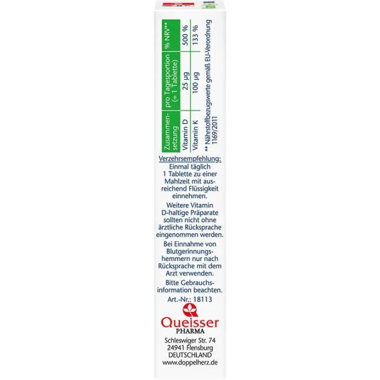Eine Tablette enthält 100 μg Vitamin K in Form von Menachinon (MK-7). Das ist ein hochwertiges Vitamin K2 und kann vom menschlichen Körper gut aufgenommen werden. Vitamin K trägt zudem zur normalen Blutgerinnung bei. Daneben enthält die Tablette 25 μg Vitamin D. Dies entspricht 1000 I.E. (Internationale Einheiten). Vitamin D leistet zudem einen Beitrag zum Erhalt einer normalen Muskelfunktion und trägt zum Erhalt einer normalen Funktion des Immunsystems bei.