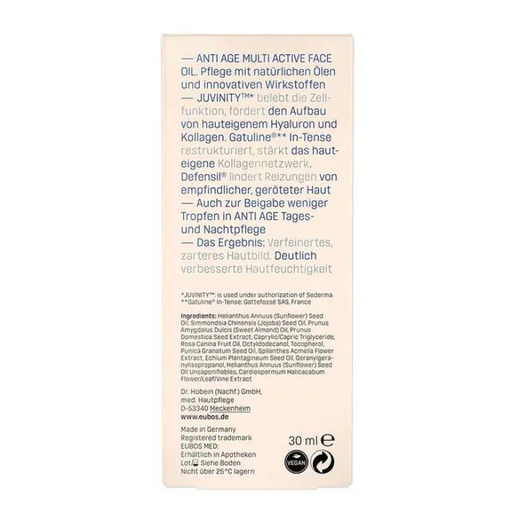 Das Eubos Anti-Age Multi Active Face Oil ist eine Pflege mit natürlichen Ölen und innovativen Inhaltsstoffen. Juvinity™*belebt die Zellfunktion, fördert den Aufbau von hauteigenem Hyaluron und Kollagen. Gatuline** In-Tense restrukturiert, stärkt das hauteigene Kollagennetzwerk. Defensil (ein pflanzlicher Wirkstoffkomplex mit Extrakt aus Herzsamen) lindert Reizungen von empfindlicher, geröteter Haut. Eubos Anti-Age Multi Active Face Oil ist auch zur Beigabe weniger Tropfen in die Anti Age Tages- und Nachtpflege geeignet. Das Ergebnis ist ein verfeinertes, zarteres Hautbild und eine deutlich verbesserte Hautfeuchtigkeit.