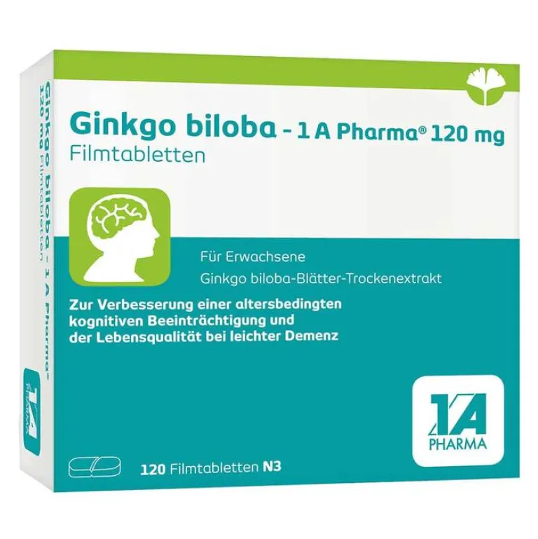 Ginkgo biloba – 1 A Pharma® 120 mg Filmtabletten Wirkstoff: Ginkgo biloba-Blätter-Trockenextrakt. Anwendungsgebiete: Pflanzliches Arzneimittel zur Verbesserung einer altersbedingten kognitiven Beeinträchtigung und der Lebensqualität bei leichter Demenz. Warnhinweis: Enthält Lactose und Glucose. Zu Risiken und Nebenwirkungen lesen Sie die Packungsbeilage und fragen Sie Ihre Ärztin, Ihren Arzt oder in Ihrer Apotheke! Mat.-Nr.: 2/51015840-02 Stand: April 2023 1 A Pharma GmbH, 83607 Holzkirchen