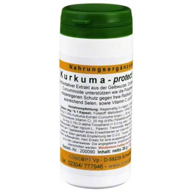 Maltodextrin, HPMC-Zellulose (vegetarische Kapselhülle), 53 mg (11,8%) Kurkuma-Extrakt (Curcuma longa L.), 30 mg (7,1%) Grüntee-Extrakt, 20 mg (4,7%) L-Ascorbinsäure (Vitamin C), 12 mg (2,8%) Hefezubereitung mit Natriumselenat, 11 mg (2,6%)D-alpha-Tocopherol, 5 mg (1,2%) schwarzer Pefferextrakt (BioPerin®). Trennmittel: Magnesiumstearat, Siliciumdioxid.