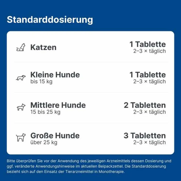 - Kleiner Hund (bis zu 15 kg), Katze: 2-3 mal täglich die Einzeldosis von 1 Tablette