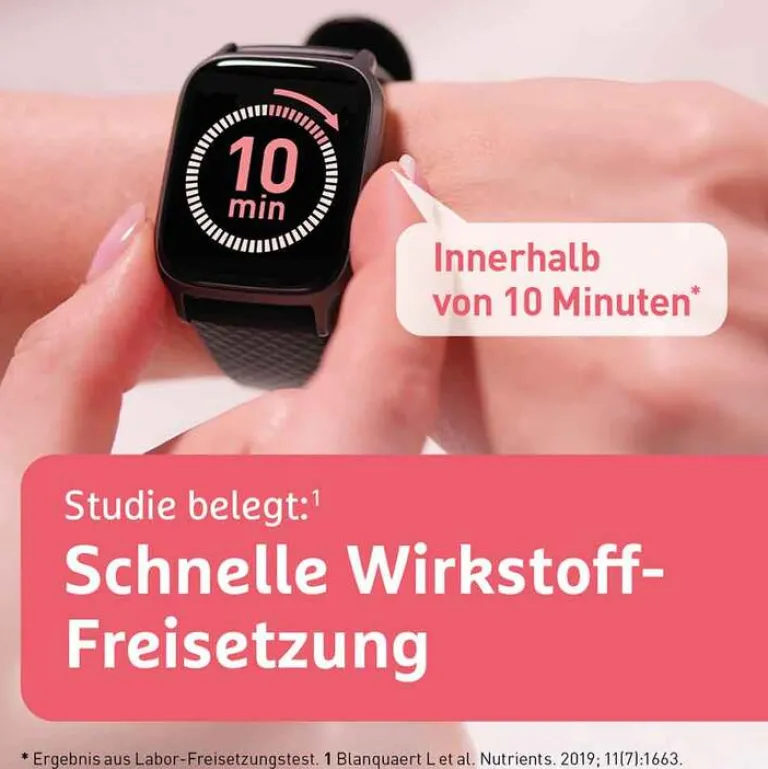 3) Blancquaert L, Vervaet C, Derave W. Nutrients. 2019; 11(7):1663. Ergebnis aus einem Wirkstoff-Freisetzungstest im Labor