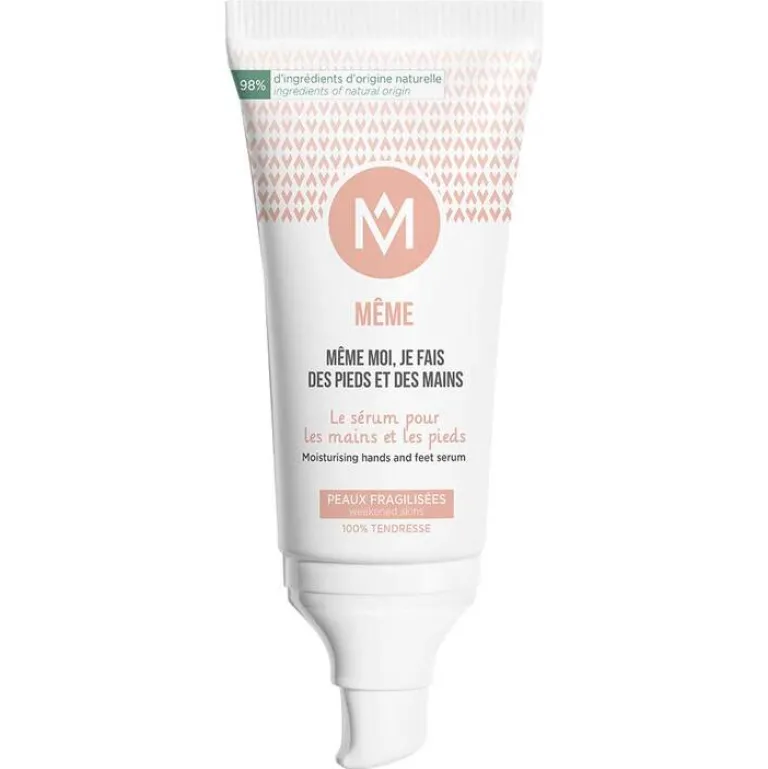 Meme hat das leistungsstarke Serum seiner legendären Pflegesocken und -handschuhe extrahiert, um daraus eine Pflege im Mitnahmeformat zu kreieren. Eine Formel, die zu 98 % natürlichen Ursprungs (auf der Grundlage von Aquaxyl, Mangobutter, Aloe-Vera-Gel und Süßmandelöl) ist und eine hohe Wirkstoffkonzentration enthält, um bei trockener, schrundiger oder geschädigter Haut aufgrund von Kälte und häufigem Waschen sowie bei Gefühlen von Kribbeln und Brennen in den Händen und Füßen für sofortige Linderung zu sorgen.