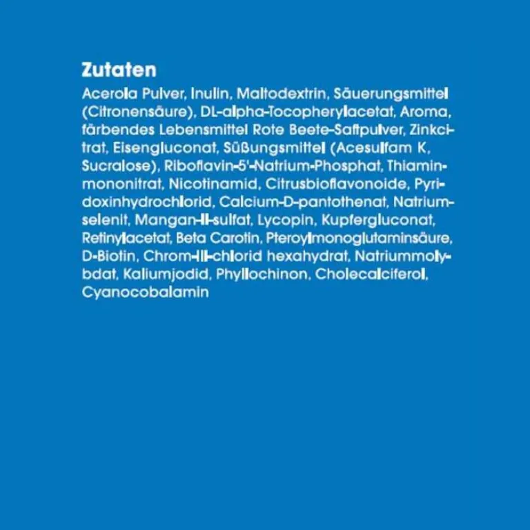 Acerola Pulver, Inulin, Maltodextrin, Säuerungsmittel (Citronensäure), DL-alpha-Tocopherylacetat, Aroma, färbendes Lebensmittel Rote Beete-Saftpulver, Zinkcitrat, Eisengluconat, Süßungsmittel (Acesulfam K, Sucralose), Riboflavin-5-Natrium-Phosphat, Thiaminmononitrat, Nicotinamid, Citrusbioflavonoide, Pyridoxinhydrochlorid, Calcium-D-pantothenat, Natriumselenit, Mangan-II-sulfat, Lycopin, Kupfergluconat, Retinylacetat, Beta Carotin, Pteroylmonoglutaminsäure, D-Biotin, Chrom-III-chlorid hexahydrat, Natriummolybdat, Kaliumjodid, Phyllochinon, Cholecalciferol, Cyanocobalamin.