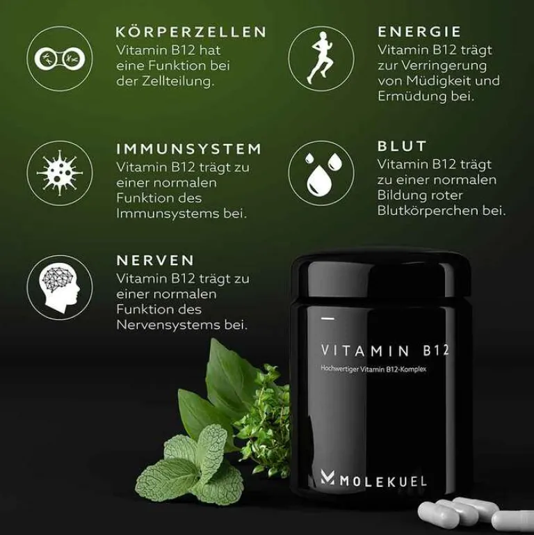 Das Molekuel Vitamin B12-Komplex wurde in Deutschland zusammen mit Experten nach höchsten Standards entwickelt. Die ausgewogene Kombination des Coenzyms aus drei verschiedenen Cobalaminen liefert Ihnen 75 µg Vitamin B12 pro Tagesdosis (1 Kapsel). Mit jedem Produkt erhalten Sie einen 4-Monatsvorrat (120 Kapseln).